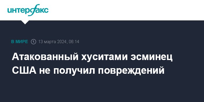 Москва. 13 марта. INTERFAX.RU - Американский эсминец Laboon, в сторону которого хуситы выпустили ракету ближнего радиуса действия, не получил повреждений, сообщает Центральное командование ВС США (CENTCOM).