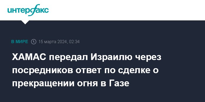 Москва. 15 марта. INTERFAX.RU - Палестинское движение ХАМАС передало Израилю в четверг через катарских и египетских посредников свой ответ относительно соглашения о прекращении огня в секторе Газа, сообщает Axios.