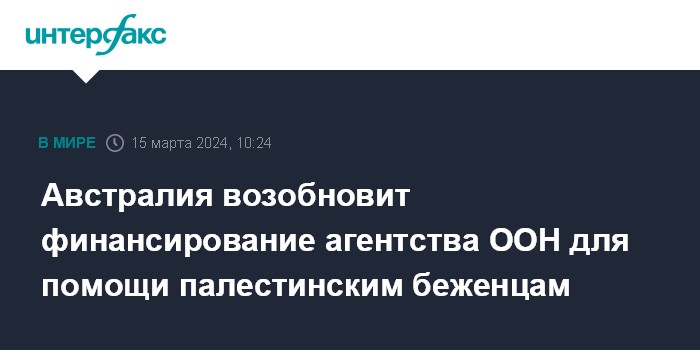 Москва. 15 марта. INTERFAX.RU - Австралия возобновит приостановленное ранее финансирование Ближневосточного агентства ООН для помощи палестинским беженцам и организации работ (БАПОР) из-за беспокойства об ухудшающейся гуманитарной ситуации в секторе Газа, сообщает в пятницу The Guardian.