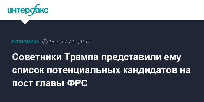 Москва. 18 марта. INTERFAX.RU - Экономические советники бывшего президента США и претендента на участие в президентских выборах 2024 года Дональда Трампа представили ему список потенциальных кандидатов на пост будущего председателя Федеральной резервной системы (ФРС), пишет The Wall Street Journal.