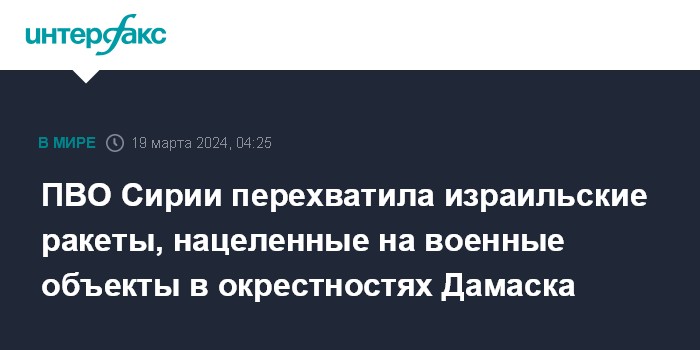 Москва. 19 марта. INTERFAX.RU - Израиль нанес ракетные удары по военным целям в пригороде столицы Сирии, сообщает телеканал Al Mayadeen.