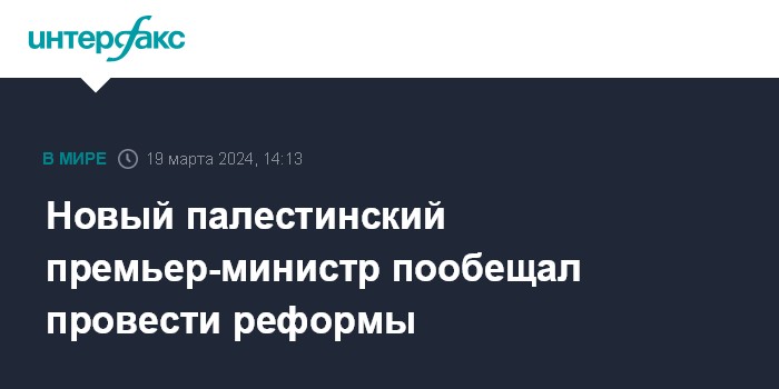 Москва. 19 марта. INTERFAX.RU - Новый палестинский премьер-министр Мухаммед Мустафа сообщил о намерениях провести реформы Палестинской национальной администрации (ПНА), приступить к восстановительным работам в секторе Газа. Заявление его офиса приводит АР.