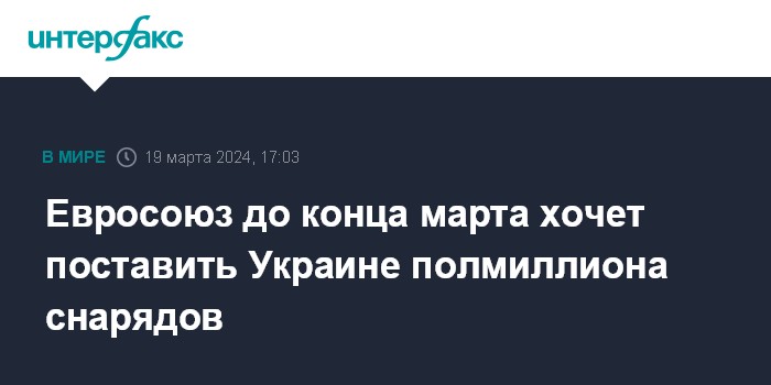 Москва. 19 марта. INTERFAX.RU - Страны Евросоюза поставят Украине до конца марта около половины от миллиона снарядов, обещанных Киеву, сообщил Петер Стано, пресс-секретарь главы европейской дипломатии Жозепа Борреля.