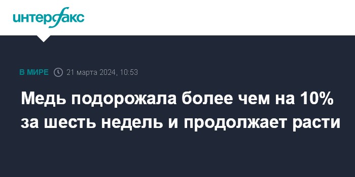 Москва. 21 марта. INTERFAX.RU - Цены на медь в мире после краткого перерыва возобновили рост после того, как Федеральная резервная система США подтвердила прогноз относительно трех снижений процентных ставок в этом году.