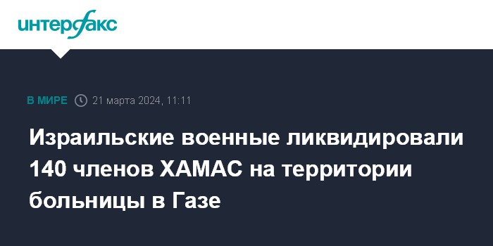 Москва. 21 марта. INTERFAX.RU - Подразделения Армии обороны Израиля (ЦАХАЛ) в ходе операции, продолжающейся в больнице "Аш-Шифа" в городе Газа, уничтожили примерно 140 вооруженных членов группировки ХАМАС, сообщает The Times of Israel со ссылкой на израильских военных.