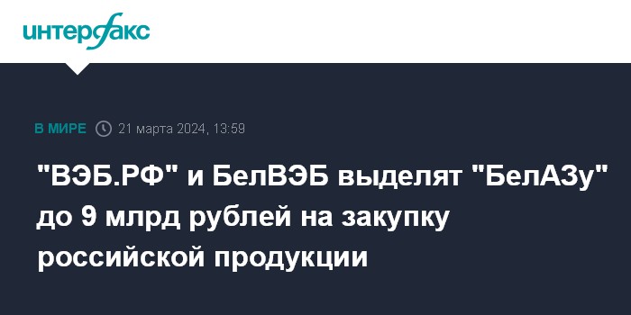 Москва. 21 марта. INTERFAX.RU - "ВЭБ.РФ" и банк БелВЭБ (дочерний банк ВЭБа) начали финансирование поставок высокотехнологичной продукции российского производства для выпуска карьерных самосвалов "БелАЗ".