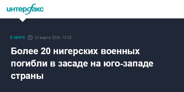 Москва. 22 марта. INTERFAX.RU - Не менее 23 нигерских военных погибли, попав в засаду на юго-западе страны между населенными пунктами Теге и Банкиларе, сообщают в пятницу западные СМИ со ссылкой на Минобороны Нигера.