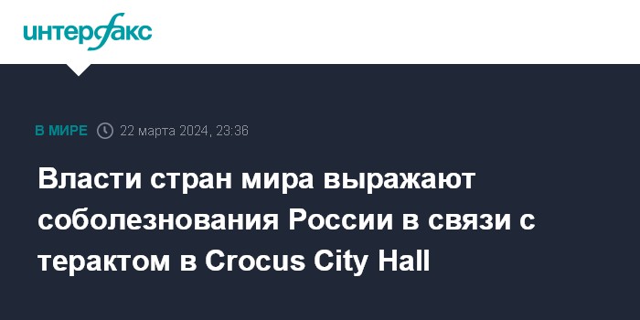 Москва. 22 марта. INTERFAX.RU - Правительства ряда стран мира в пятницу вечером выразили соболезнования России в связи с гибелью людей в результате теракте в Crocus City Hall в подмосковном Красногорске.
