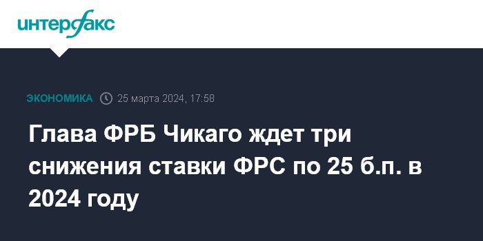 Москва. 25 марта. INTERFAX.RU - Президент Федерального резервного банка (ФРБ) Чикаго Остан Гулсби ожидает, что ФРС США трижды снизит базовую процентную ставку по 25 базисных пунктов (б.п.) в 2024 году.