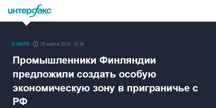 Москва. 25 марта. INTERFAX.RU - Конфедерация финской промышленности предлагает создать особую экономическую зону в приграничной с Россией Восточной Финляндии, чтобы сохранить жизнеспособность региона.