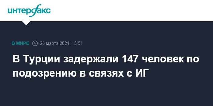 Москва. 26 марта. INTERFAX.RU - Сотрудники правоохранительных органов Турции задержали 147 человек, подозреваемых в связях с террористической организацией "Исламское государство" (ИГ, запрещенная в РФ террористическая организация), сообщил во вторник глава МВД Турции Али Ерликая.