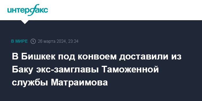 Москва. 26 марта. INTERFAX.RU - Бывший заместитель председателя Таможенной службы Киргизии Раимбек Матраимов экстрадирован в Бишкек из Азербайджана, видео прибытия бывшего киргизского чиновника распространено во вторник.