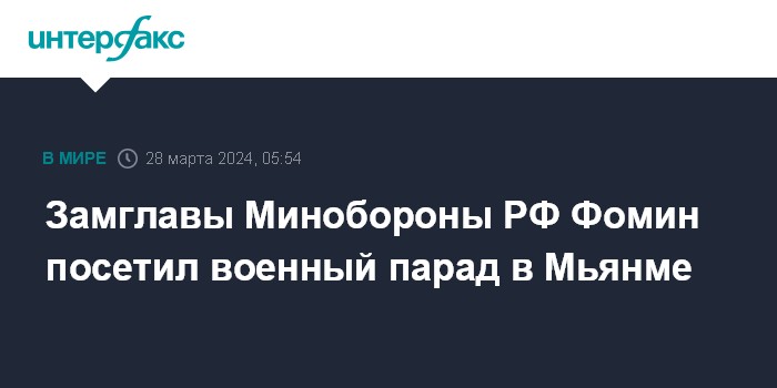 Москва. 28 марта. INTERFAX.RU - Заместитель министра обороны РФ Александр Фомин и члены Общественного совета при министерстве обороны РФ стали почётными гостями парада в честь 79-й годовщины образования вооружённых сил Мьянмы, который прошёл в столице страны Нейпьидо в четверг, сообщает российское военное ведомство.