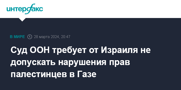 Москва. 28 марта. INTERFAX.RU - Международный суд ООН в четверг вынес ряд дополнительных промежуточных мер по иску ЮАР против Израиля и потребовал, в частности, чтобы его армия не допускала нарушения прав палестинцев в секторе Газа.