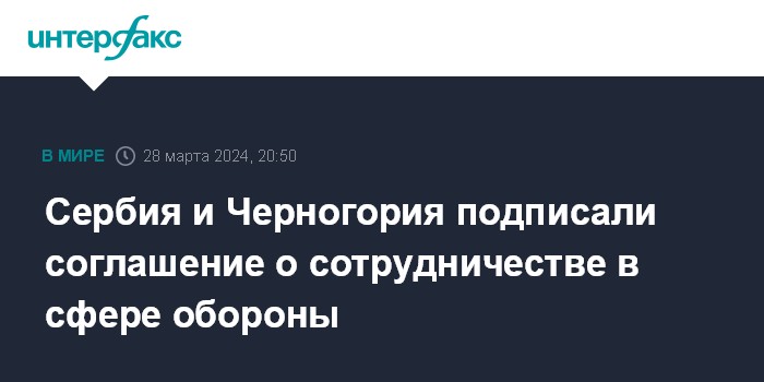 Москва. 28 марта. INTERFAX.RU - Представители министерств обороны Сербии и Черногории подписали в четверг соглашение о военном сотрудничестве на 2024 год, сообщает сербская газета "Политика" со ссылкой на черногорское оборонное ведомство.