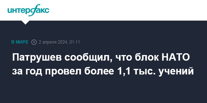 Москва. 2 апреля. INTERFAX.RU - Секретарь Совбеза России Николай Патрушев заявил, что блок НАТО за прошедший год провел свыше 1 тыс. 130 учений, в том числе у границ РФ, направленных на сдерживание России.