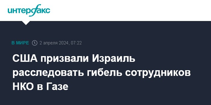 Москва. 2 апреля. INTERFAX.RU - США призывают Израиль незамедлительно расследовать сообщения об ударе армии обороны Израиля в секторе Газа, в результате которого погибли по меньшей мере четыре сотрудника международной благотворительной организации "Всемирная центральная кухня".