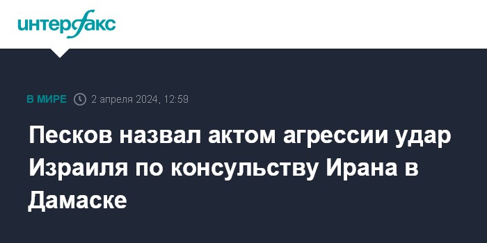 Москва. 2 апреля. INTERFAX.RU - Удар по консульству Ирана в Дамаске, в ходе которого погибли несколько высокопоставленных представителей Корпуса стражей исламской революции, является нарушением международного права и актом агрессии, заявил пресс-секретарь президента РФ Дмитрий Песков.