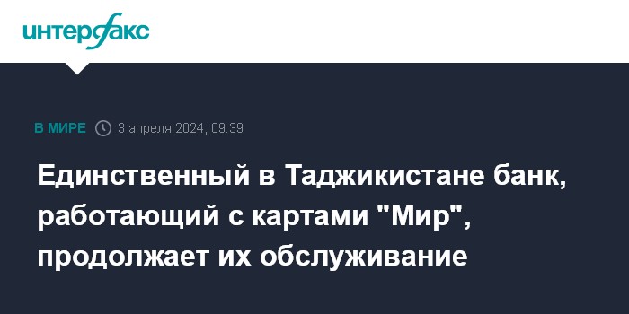 Москва. 3 апреля. INTERFAX.RU - В Государственном унитарном предприятии "Сберегательный банк республики Таджикистан "Амонатбанк", которое является одним из трех системообразующих кредитных организаций страны, продолжают обслуживать карты "Мир", сообщили в кол-центре банка.