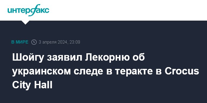 "Шойгу подчеркнул, что начатое в связи с террористическим актом в "Крокус Сити Холле" расследование будет безусловно доведено до конца, а все виновные будут наказаны. Имеются сведения об украинском следе в организации теракта", - говорится в сообщении Минобороны РФ по итогам телефонных переговоров Шойгу и Лекорню.