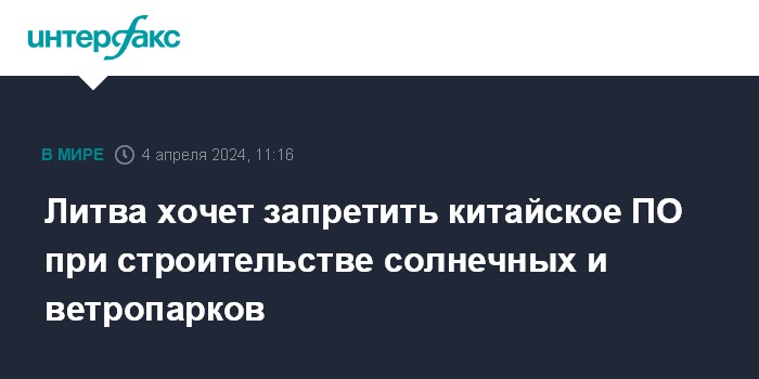 Москва. 4 апреля. INTERFAX.RU - Министерство энергетики Литвы намерено запретить использование китайского программного обеспечения при строительстве солнечных и ветряных электростанций мощностью более 100 кВт, заявил радиостанции Ziniu radijas глава ведомства Дайнюс Крейвис.