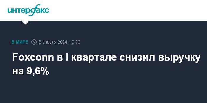 Москва. 5 апреля. INTERFAX.RU - Тайваньская Hon Hai Precision Industry Co. (Foxconn Technology), крупнейший в мире производитель электроники по контрактам и поставщик Apple, в первом квартале снизил выручку на 9,6% относительно того же периода прошлого года – до 1,32 трлн новых тайваньских долларов ($41,2 млрд).