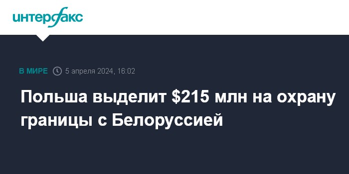 Москва. 5 апреля. INTERFAX.RU - Польша в 2024 году направит $215 млн на усиление военного присутствия на границе с Белоруссией, объявил министр национальной обороны Польши Владислав Косиняк-Камыш. Об этом сообщает агентство PAP.