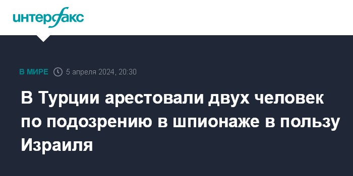 Москва. 5 апреля. INTERFAX.RU - Власти Турции взяли под стражу двух человек, которых подозревают в связях с израильской разведкой. Об этом сообщает в пятницу агентство "Анадолу" со ссылкой на заявление главы МВД Турции Али Ерликая в соцсети X.