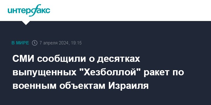 Москва. 7 апреля. INTERFAX.RU - Ливанское движение "Хезболла" в воскресенье заявило, что запустило десятки ракет в сторону израильских объектов на Голанских высотах.