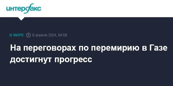 Москва. 8 апреля. INTERFAX.RU - В ходе переговоров в Каире о перемирии в секторе Газа был достигнут прогресс, стороны пришли к соглашению по основным пунктам, сообщил в понедельник египетский государственный телеканал "Аль-Кахера" со ссылкой на информированный источник.