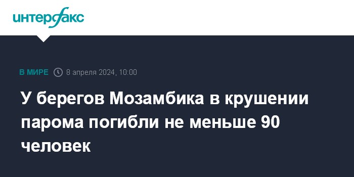 Москва. 8 апреля. INTERFAX.RU - У берегов Мозамбика затонуло перегруженное рыболовецкое судно, которое использовалось как паром, из 130 человек, находившихся на борту, погибли не менее 90, в том числе дети, сообщает АР со ссылкой на местное интернет-издание TV Diário Nampula.