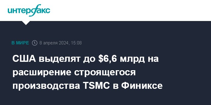 Москва. 8 апреля. INTERFAX.RU - Администрация президента США Джо Байдена пообещала выделить до $6,6 млрд на расширение строящегося производства Taiwan Semiconductor Manufacturing (TSMC) в Финиксе (штат Аризона). Об этом сообщает Associated Press со ссылкой на заявление министра торговли страны Джины Раймондо.