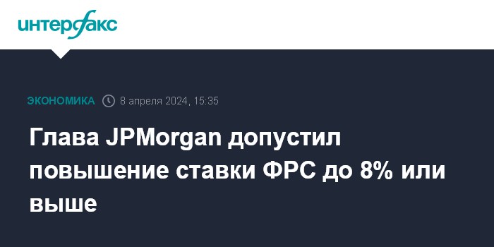 Москва. 8 апреля. INTERFAX.RU - Федеральная резервная система США может повысить процентные ставки до 8% или более из-за устойчивого инфляционного давления, стимулируемого в том числе дефицитом бюджета и военными конфликтами, полагает глава JPMorgan Chase & Co. Джейми Даймон.