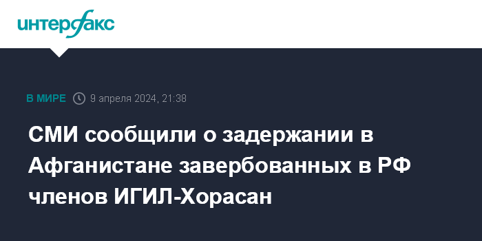 Москва. 9 апреля. INTERFAX.RU - Афганское новостное и аналитическое издание Al Mirsaad опубликовало видео допроса двух граждан Таджикистана, принадлежащих к ИГИЛ-Хорасан (запрещенная в РФ террористическая организация), которые были завербованы в России и отправлены в Афганистан.