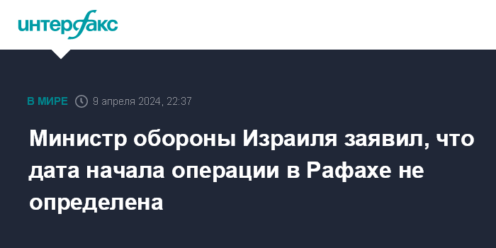 Москва. 9 апреля. INTERFAX.RU - Глава Минобороны Израиля Йоав Галлант заявил шефу Пентагона Ллойду Остину, что Израиль пока не определил точную дату начала планируемой операции в Рафахе на юге сектора Газа, сообщает во вторник Axios со ссылкой на источник.