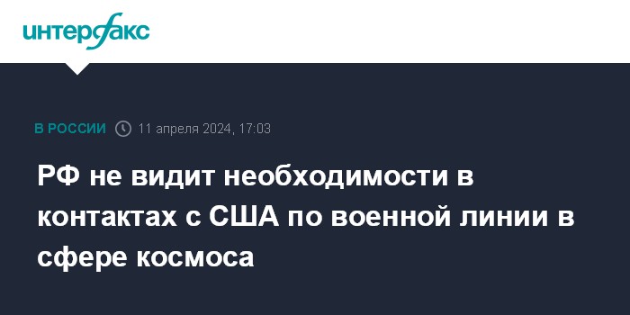 Москва. 11 апреля. INTERFAX.RU - Москва не видит необходимости в создании деконфликтного канала с США в сфере космоса в нынешних условиях, заявил в четверг замглавы МИД РФ Сергей Рябков.