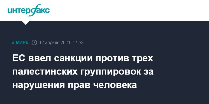 Москва. 12 апреля. INTERFAX.RU - Совет ЕС в пятницу включил три палестинские группировки - "Бригады аль-Кудс", "Бригады аль-Кассама" и "Нухба" в список глобальных санкций Евросоюза за нарушения прав человека.