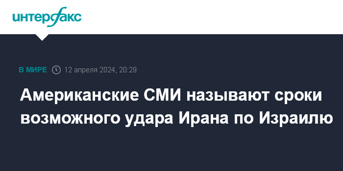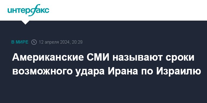 Москва. 12 апреля. INTERFAX.RU - Американские СМИ сообщают разные данные о том, когда Иран может нанести удар по Израилю, в том числе - в пятницу или в ближайшие двое суток; также имеется информация о том, что в Тегеране еще не приняли решение об ударе.