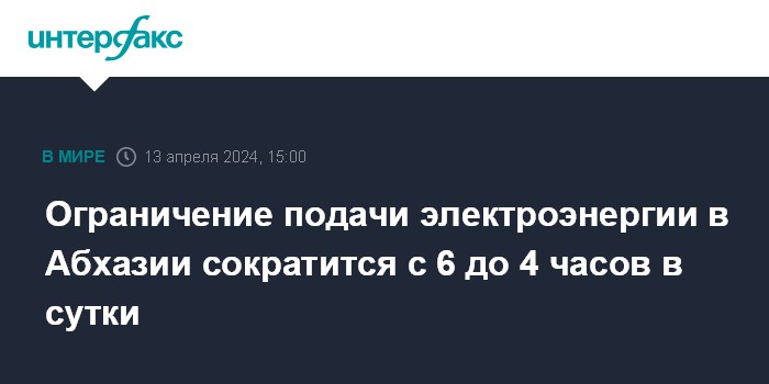 Москва. 13 апреля. INTERFAX.RU - В Абхазии смягчили ограничения на подачу электроэнергии в города и районы республики в связи с возобновлением работы ИнгурГЭС, шестичасовые ограничения подачи электричества заменяются на четырехчасовые, сообщает в субботу абхазская энергетическая компания "Черноморэнерго".