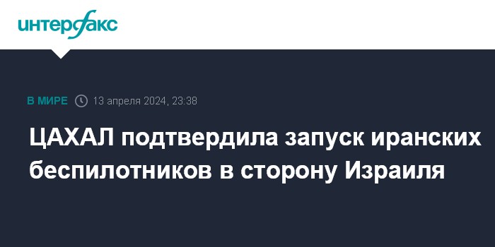 Москва. 13 апреля. INTERFAX.RU - Армия обороны Израиля (ЦАХАЛ) подтвердила, что с территории Ирана в сторону Израиля в субботу стартовали десятки беспилотников, сообщает The Times of Israel.