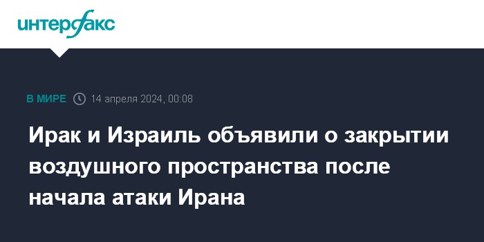 Москва. 14 апреля. INTERFAX.RU - Минтранс Ирака в субботу объявил о закрытии иракского воздушного пространства после того, как ранее стало известно о запуске десятков иранских беспилотников в сторону Израиля, сообщает телеканал "Аль-Джазира".