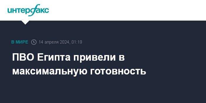 Москва. 14 апреля. INTERFAX.RU - Силы ПВО Египта приведены в состояние максимальной готовности в связи с сообщениями о запуске беспилотников из Ирана в сторону Израиля, цитирует агентство ЭФЭ сообщения египетских СМИ.