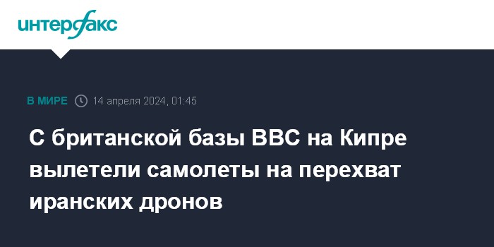 Москва. 14 апреля. INTERFAX.RU - Британские военные самолеты взлетели с Кипра для возможного перехвата беспилотников, выпущенных из Ирана в сторону Израиля.
