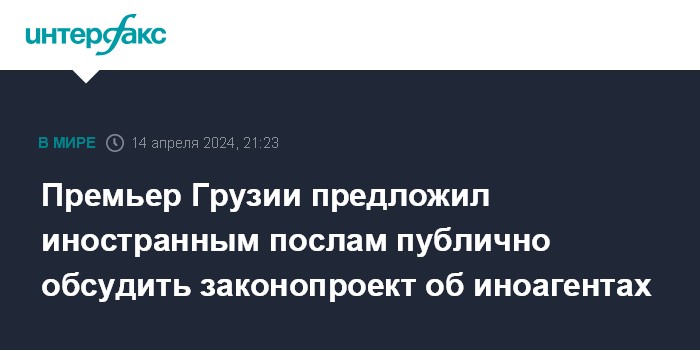 Москва. 14 апреля. INTERFAX.RU - Премьер-министр Грузии Ираклий Кобахидзе предложил послам США, Евросоюза и стран-членов ЕС провести публичную дискуссию по законопроекту "О прозрачности иностранного влияния", который с будущей недели будет рассматриваться в парламенте.
