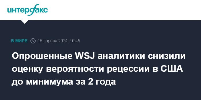 Москва. 15 апреля. INTERFAX.RU - Оценка вероятности наступления рецессии в США в ближайшие 12 месяцев составляет 29%, по данным регулярного опроса аналитиков и экономистов, который проводит The Wall Street Journal.