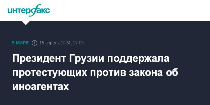 Москва. 15 апреля. INTERFAX.RU - Президент Грузии Саломе Зурабишвили поддержала участников проходящей в Тбилиси у здания парламента акции протеста против принятия закона об иноагентах ("О прозрачности иностранного влияния").