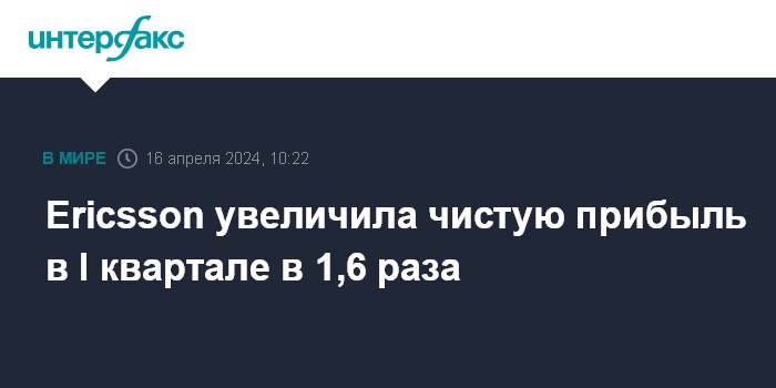 Москва. 16 апреля. INTERFAX.RU - Шведский производитель телекоммуникационного оборудования Ericsson AB увеличил чистую прибыль в первом квартале в 1,6 раза, несмотря на 15%-е снижение выручки.