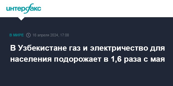 Москва. 16 апреля. INTERFAX.RU - Правительство Узбекистана своим постановлением с 1 мая вводит социальные нормы потребления природного газа и электроэнергии для бытовых потребителей, при этом цены для населения вырастут в среднем в 1,6 раза.