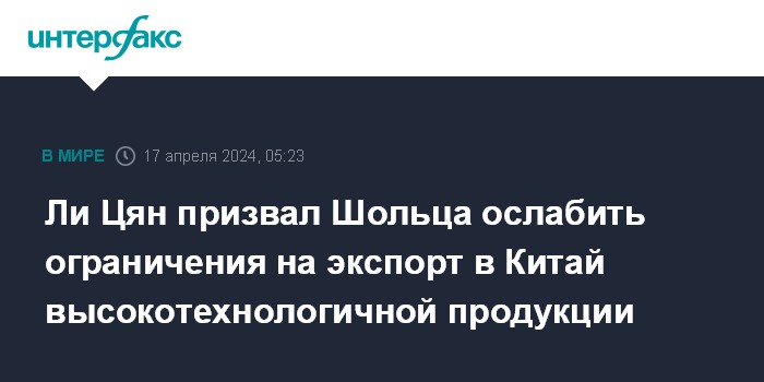 Москва. 17 апреля. INTERFAX.RU - Премьер Госсовета КНР Ли Цян в ходе переговоров с находящимся в Пекине с визитом канцлером ФРГ Олафом Шольцем призвал ослабить ограничения на экспорт в Китай высокотехнологичной продукции и обеспечить благоприятные условия для деятельности в Германии китайских предприятий.