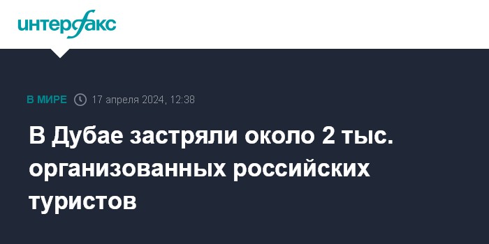 Москва. 17 апреля. INTERFAX.RU - Около 2 тысяч организованных российских туристов не могут вылететь из Дубая из-за непогоды, туроператоры обеспечили им размещение и питание, сообщает в среду пресс-служба Минэкономразвития РФ.
